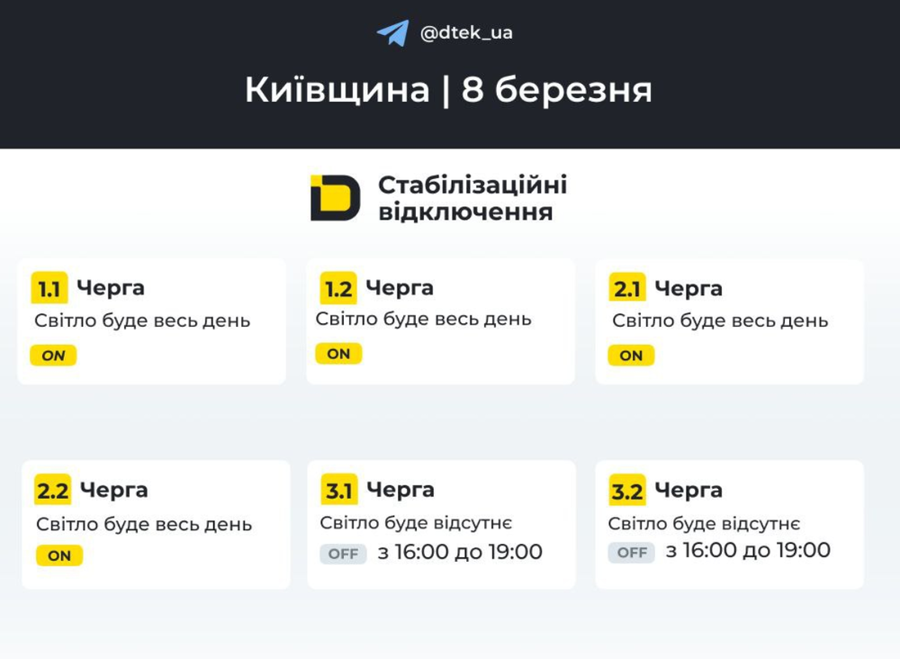 "У разі змін, будемо оперативно вас інформувати у нашому телеграм-каналі. Підписуйтесь та поділіться, будь ласка, з родичами та друзями", – повідомляє ДТЕК.