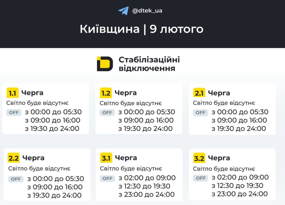У понеділок, дев’ятого лютого, на Київщині діятимуть стабілізовані відключення електропостачання. Про це повідомляє ДТЕК.