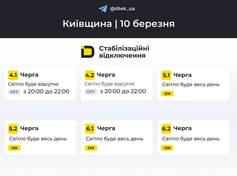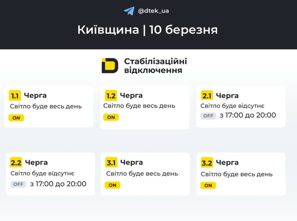 Сьогодні, 10 березня, на Київщині діють стабілізовані і екстрені відключення світла. Про це повідомляє КМВА та ДТЕК.