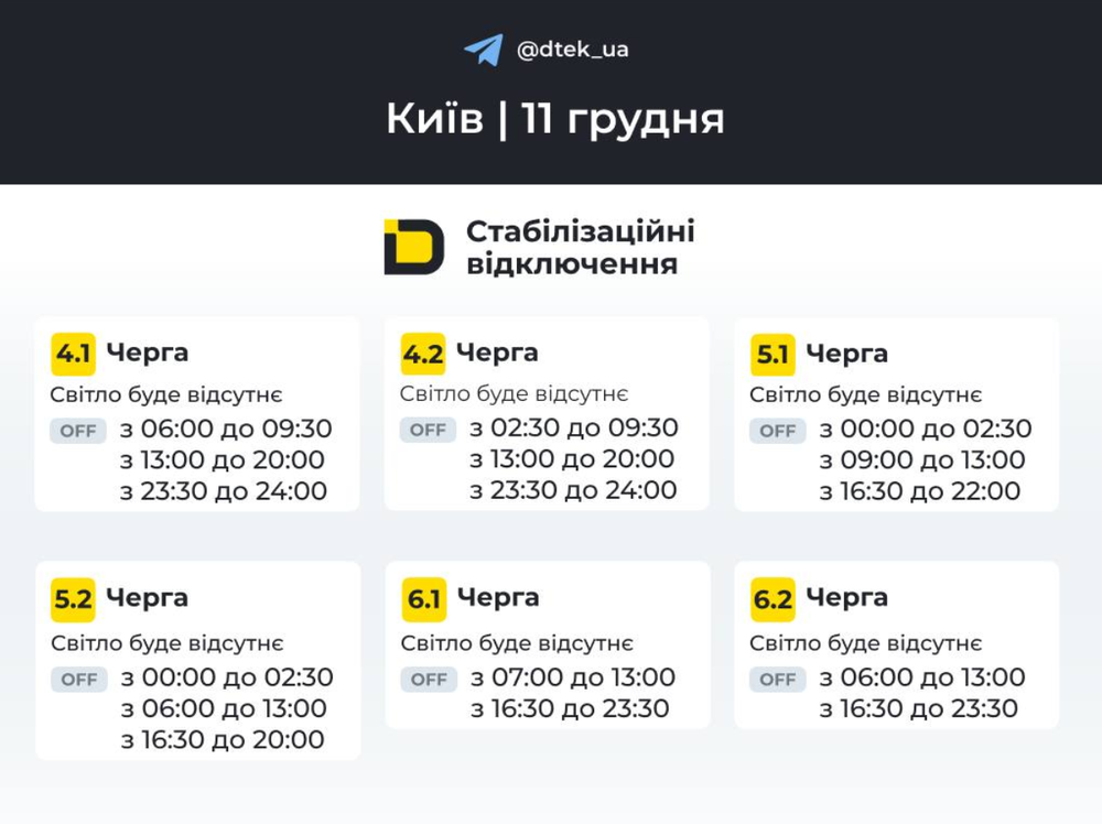 Графік відключень світла на 11 грудня