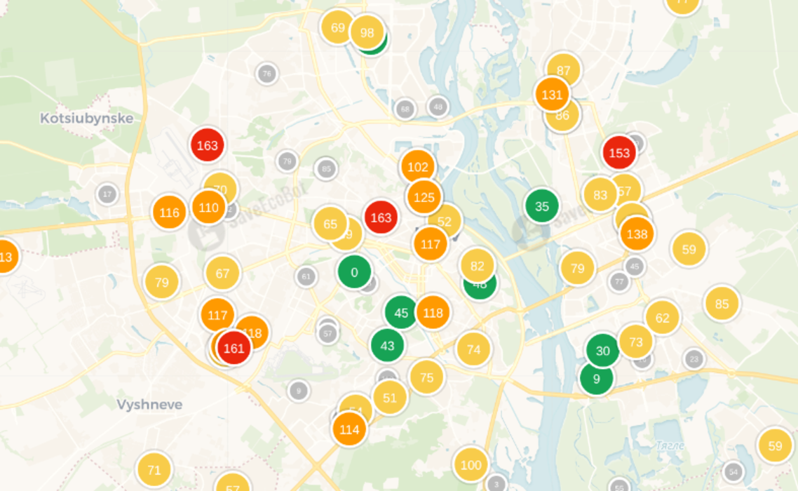 Після 8:00 найгірший стан повітря спостерігається на Правому березі міста. Саме тут переважають високі показники забруднення повітря.