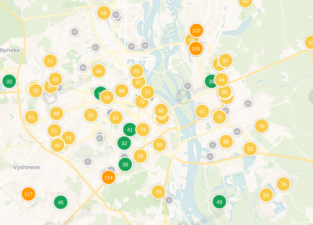 "Станом на 15:00, 22 лютого 2026 року дорівнює 70 – це помірний рівень забруднення атмосферного повітря, який може викликати незначний дискомфорт при диханні у чутливих людей", – повідомляє сервіс моніторингу saveecobot.