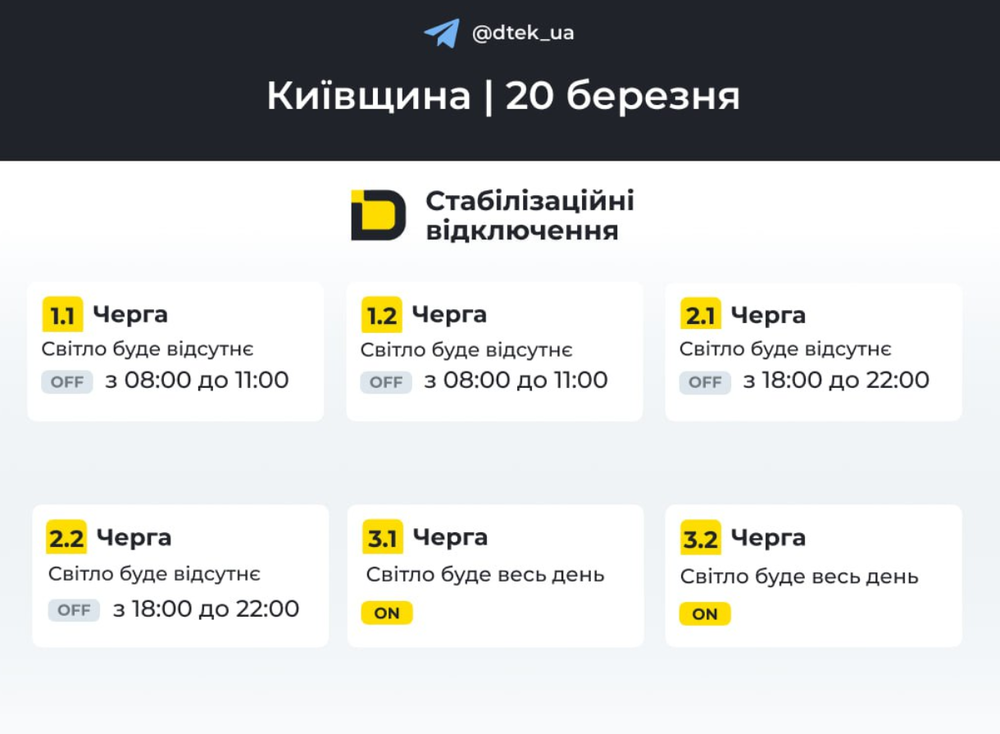 Сьогодні, 20 березня, діють стабілізовані відключення електропостачання. Про це повідомляє ДТЕК.