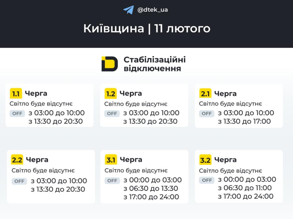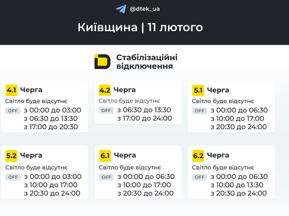 У середу, 11 лютого, діятимуть стабілізовані відключення електропостачання. Про це повідомляє ДТЕК.