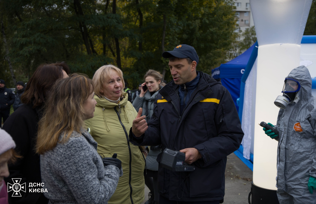"За легендою, внаслідок умовного влучання сталася радіаційна аварія. На місці події рятувальники оперативно розгорнули пункт масової деконтамінації — місце, де проводиться санітарна обробка населення, що потрапило до зони забруднення", – повідомляє ДСНС Києва.