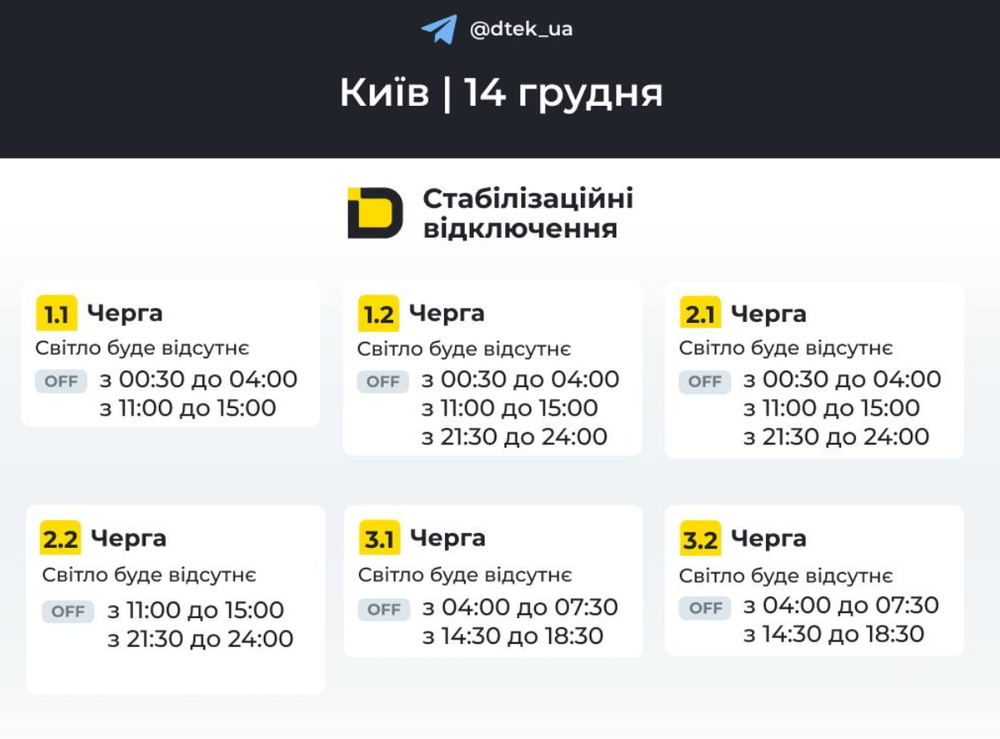 Завтра, 14 грудня, в Києві діятимуть нові графіки відключень світла. Про це повідомляє компанія ДТЕК.