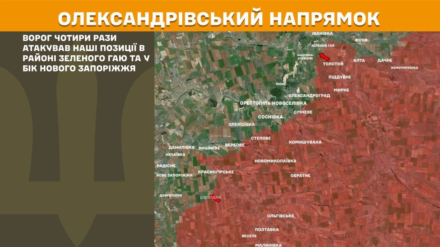 На Олександрівському напрямку ворог чотири рази атакував позиції Сил оборони в районі Зеленого Гаю та у бік Нового Запоріжжя.