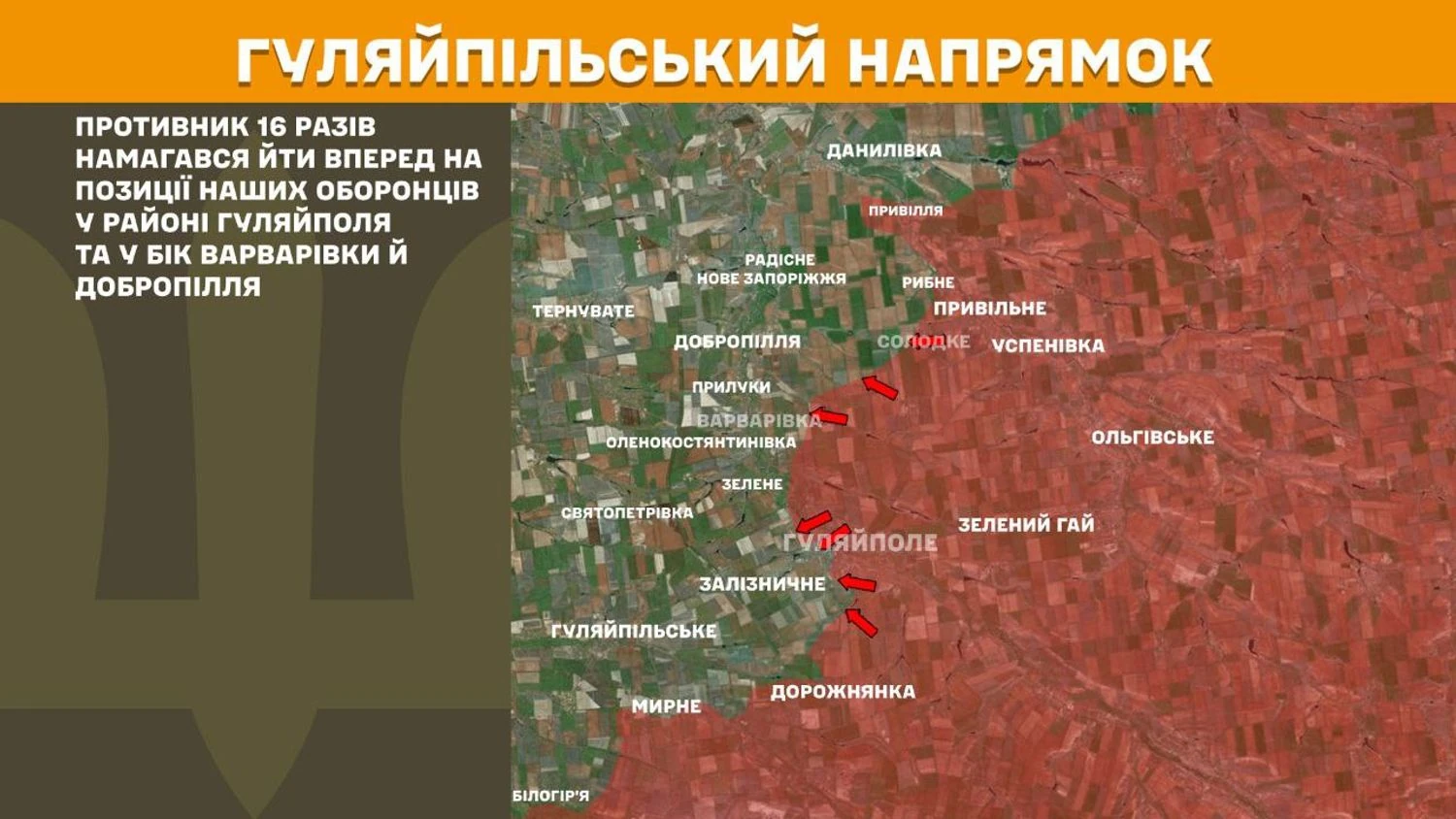 На Гуляйпільському напрямку противник 16 разів намагався йти вперед на позиції Сил оборони у районі Гуляйполя та у бік Варварівки й Добропілля.