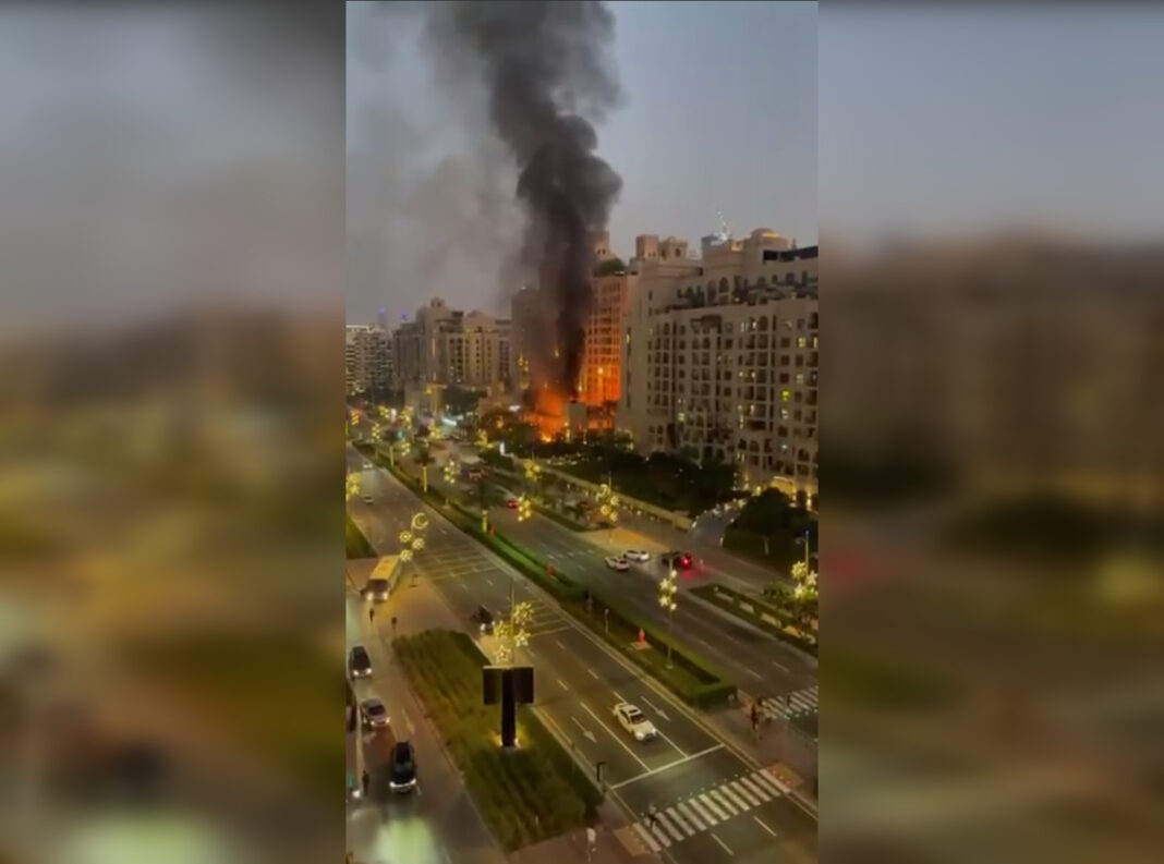 Кадри прильоту іранської цілі оприлюднила низка моніторингових каналів та ЗМІ. За даними видання Astra, ворожа балістична ракета влучила поруч із п'ятизірковим готелем Fairmont The Palm, внаслідок чого сталась пожежа.