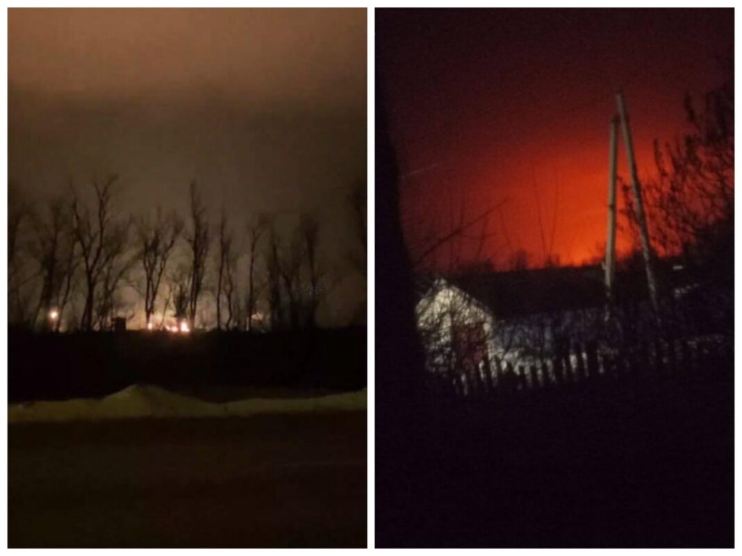 У мережі поширили кадри з місця подій. На відеороликах видно яскраву заграву у небі та вогонь, що охопив територію.