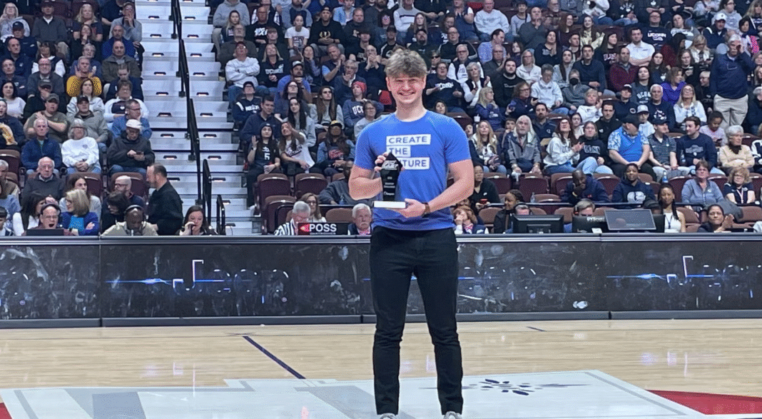 Молодий мільярдер і співзасновник Mercor Брендан Фуді стоїть на арені з нагородою в руках перед великою аудиторією