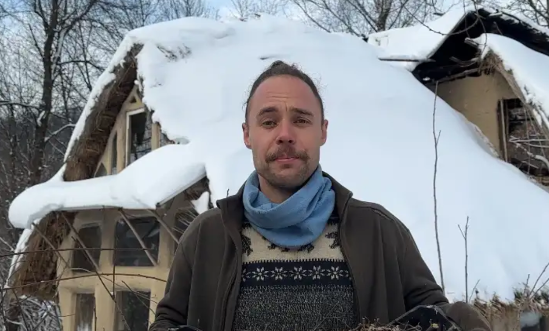 "Сьогодні ми дізнаємося, чи можна обігріти глиняну хатинку, використовуючи подрібнені чагарники та обрізки з саду в -10. Ху-ху-ху!" — каже у кадрі молодий чоловік.