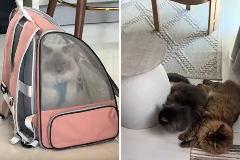 Кадри демонструють, як її коти-самці нервово ховаються під столом, спостерігаючи за переносною сумкою, у якій перебувала чужа кішка. Улюбленці, широко розплющивши очі, злякано поглядають на кішку Шанель, яку на той момент ще навіть не випустили звідти.