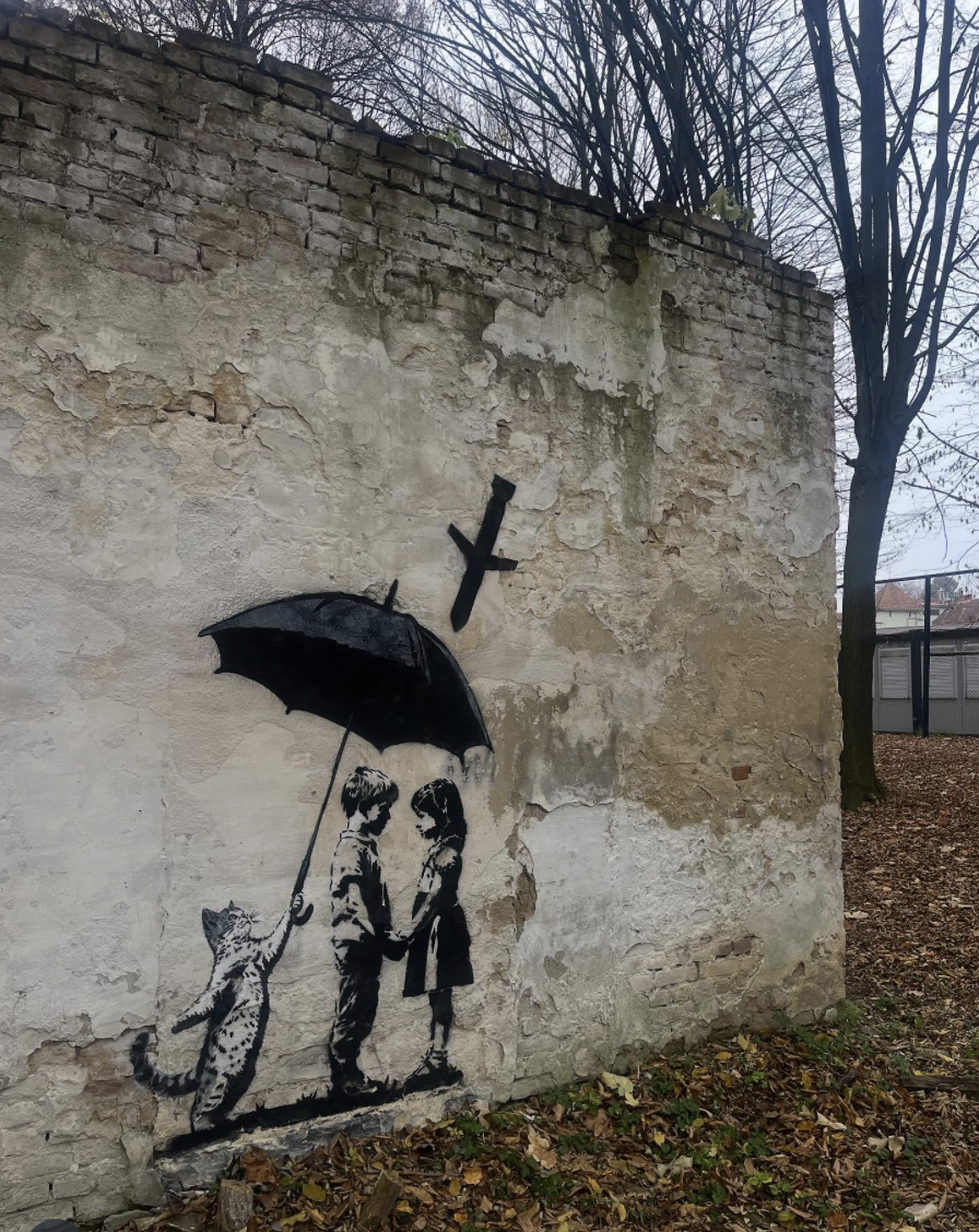Зранку 8 листопада у Львові виявили графіті, яке дуже нагадує стиль всесвітньо відомого англійського художника Бенксі. Раніше він уже приїздив до України та залишав свої роботи на деокупованій Київщині у 2022 році.